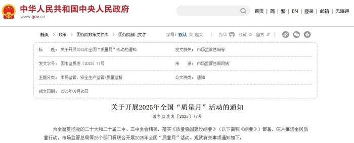 近日,市场监管总局、中央宣传部、国家发展改革委、住房城乡建设部等26个部门联合发布《关于开展2025年全国“质量月”活动的通知》。今年“质量月”活动以“加强全面质量管理 促进质量强国建设”为主题,活动时间为9月。